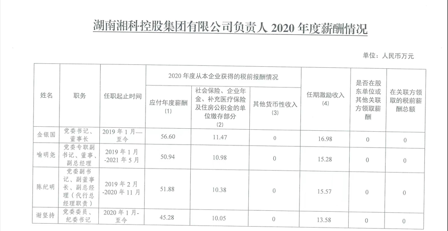 湖南湘科控股集團(tuán)有限公司負(fù)責(zé)人2020年度薪酬情況